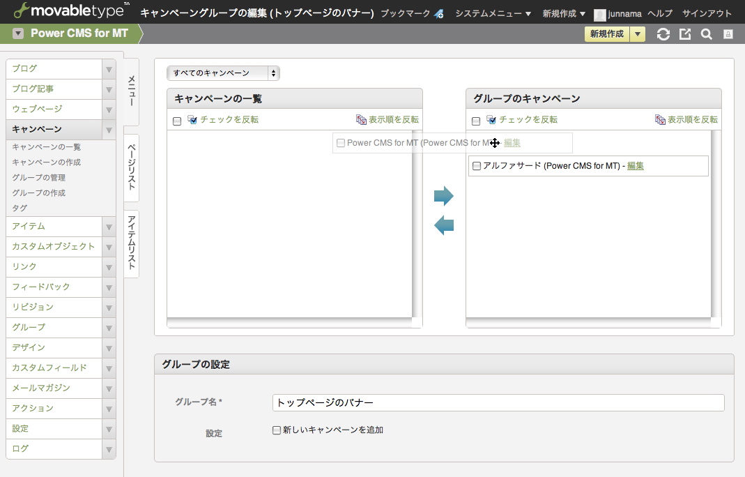 Campaign *とは、タイトル、URL、画像、ムービー、テキスト、メモ等のフィールドを持つMovable Typeのオブジェクトです。カスタムフィールドに対応しているため、自由に入力項目を拡張することができます。画像とムービーは MT::Asset オブジェクトとして管理されます。キャンペーングループをドラッグ&ドロップインターフェイスで登録することが出来ます。