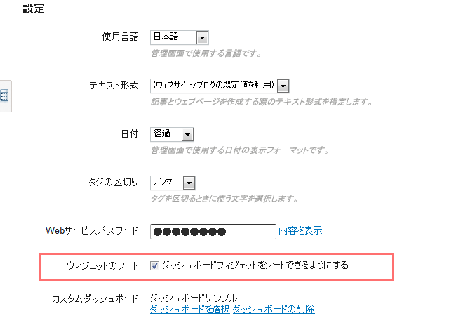 並べ替えの機能を利用するにはユーザ情報の編集画面で「ウィジェットのソート」チェックボックスにチェックを入れて有効にします。