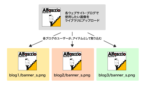 システムレベルに「ライブラリ」として画像などのアイテムを置く場所を擬似的に作るようなイメージです。その「ライブラリ」から、任意のファイルを各ウェブサイト・ブログにアイテムとしてインポートすることが可能になります。