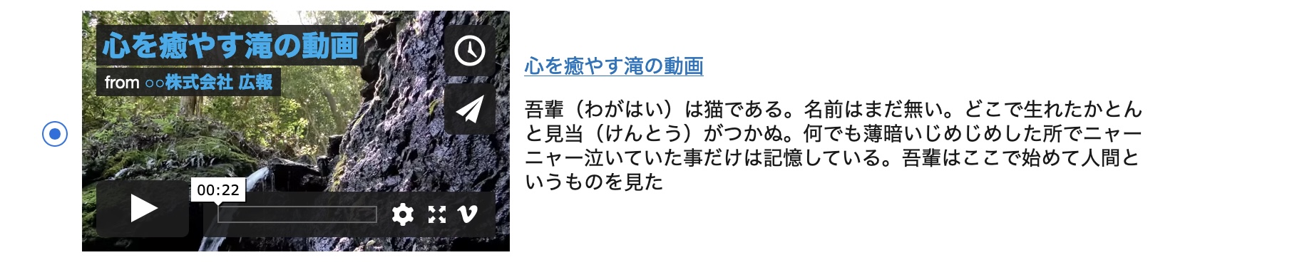 PowerCMS 6 では、動画ストリーミングサービス Vimeo の動画を、クリック操作のみで本文欄に埋め込むことができるようになりました。ホスティングのみならず、高機能な動画エディタが備わったサービスとの連携により、動画の提供についても強力にサポートします。