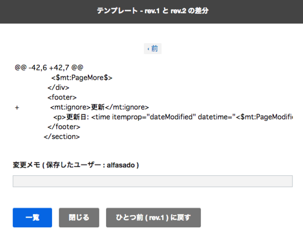 テンプレートの更新履歴の差分(diff)を表示することで、更新された内容を可視化できるようになります。ウェブサイト/ブログ/システムすべてのテンプレートが対象になります。