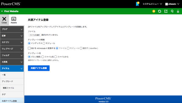 commonフォルダのような名前で作成されることの多い、JavaScript、CSS、画像パーツなどを一括登録する機能が追加されます。ZIPファイルとしてアーカイブを作成し、管理画面の「共通アイテム登録」画面から登録します。テキストファイル(RegisterTemplateExtensions環境変数にカンマ区切りで指定)はインデックス・テンプレートに、画像ファイル(RegisterAssetExtensions環境変数にカンマ区切りで指定)は「アイテム」に一括登録できます。テキストファイル内のSSIをMTIncludeに自動変換することもできます。