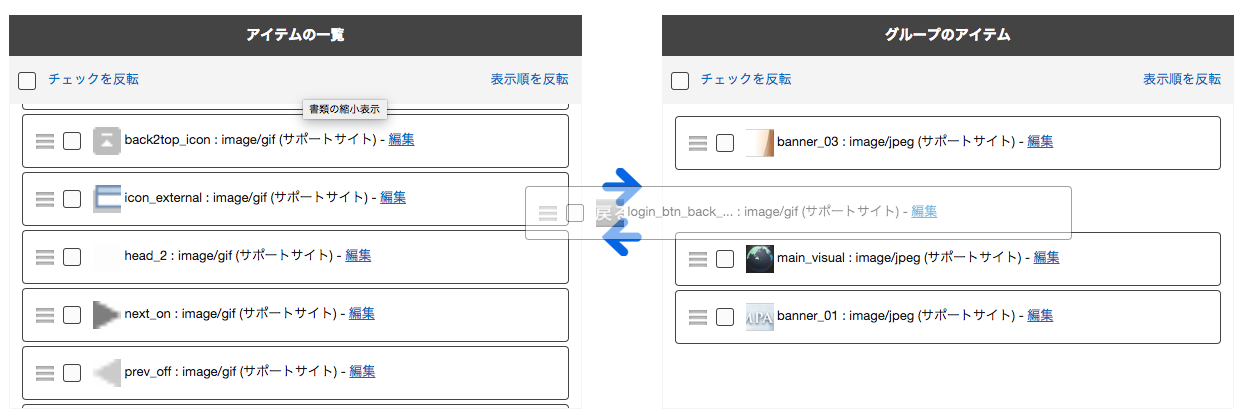 下記のように、画面左の「アイテムの一覧」から右の「グループのアイテム」に登録したい項目をドラッグするか、登録したい項目にチェックを入れて右矢印をクリックします。ドラッグ&ドロップで項目の並び順を変更できます。