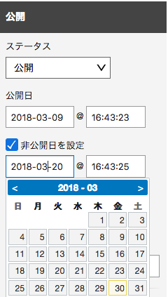 指定日非公開を実行するには、記事/ウェブページ編集画面の「公開」ウィジェット内の「非公開日を設定」チェックボックスにチェックを入れ、非公開日時を指定します(カレンダーから日を指定することもできます)。