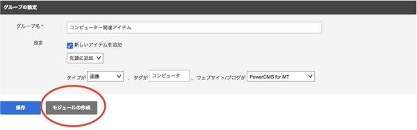 グループを作成して保存すると管理画面下部の「保存」ボタンの横に表示される「モジュールの作成」ボタンからテンプレートモジュールを自動的に作成することができます。