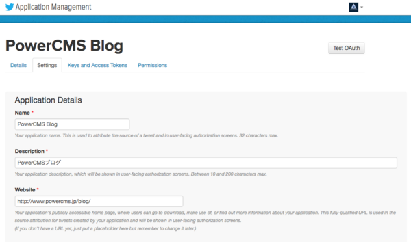 - 「Deteils」タブを選択して表示される「Consumer key」「Consumer secret」「Callback URL」の値を、プラグイン設定画面にコピーして入力し「変更を保存」します。