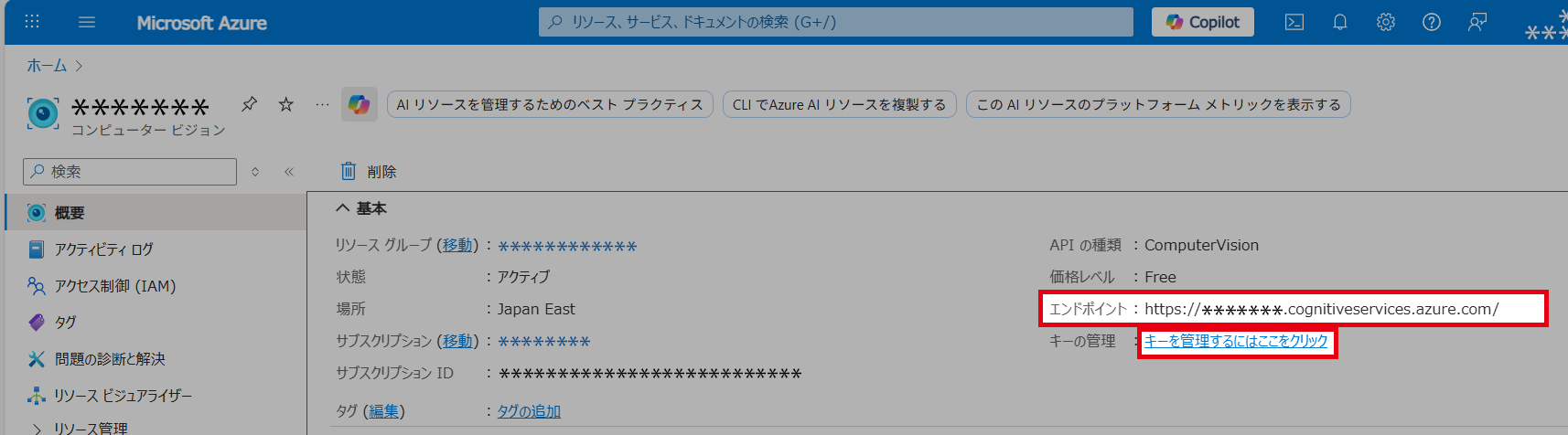 Microsoft Azure ポータル にアクセスし、『「+」リソースの作成』→「AI アプリとエージェント」→「Computer Vision」と遷移し、リソースを作成します。 (※ポータル上ではリソース名として 「Computer Vision」 と表示されていますが、サービス名としては Azure AI Vision に該当します)