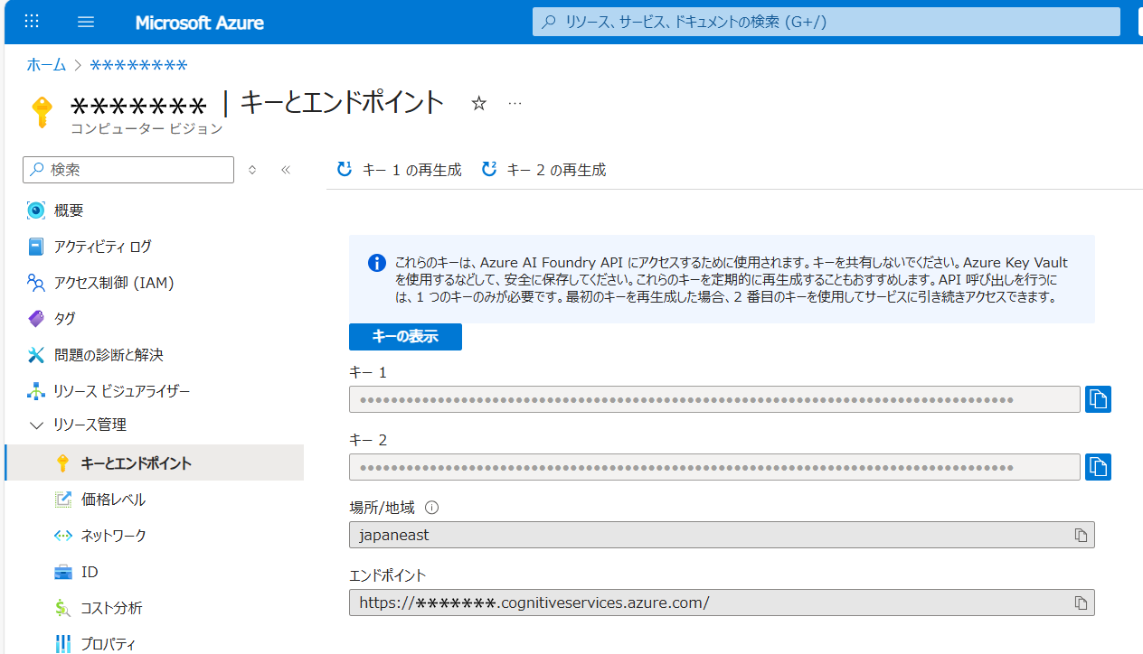 - API リージョン … 作成時に選択した「場所」別のエンドポイント